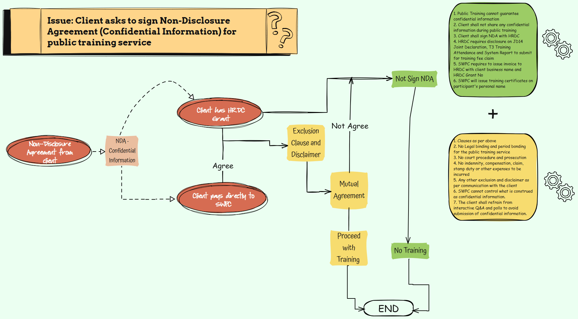 When the client is asking SW Project Consulting (SWPC) to sign non-disclosure agreement - Confidential Information to attend public training organized by SWPC, the response is at below.