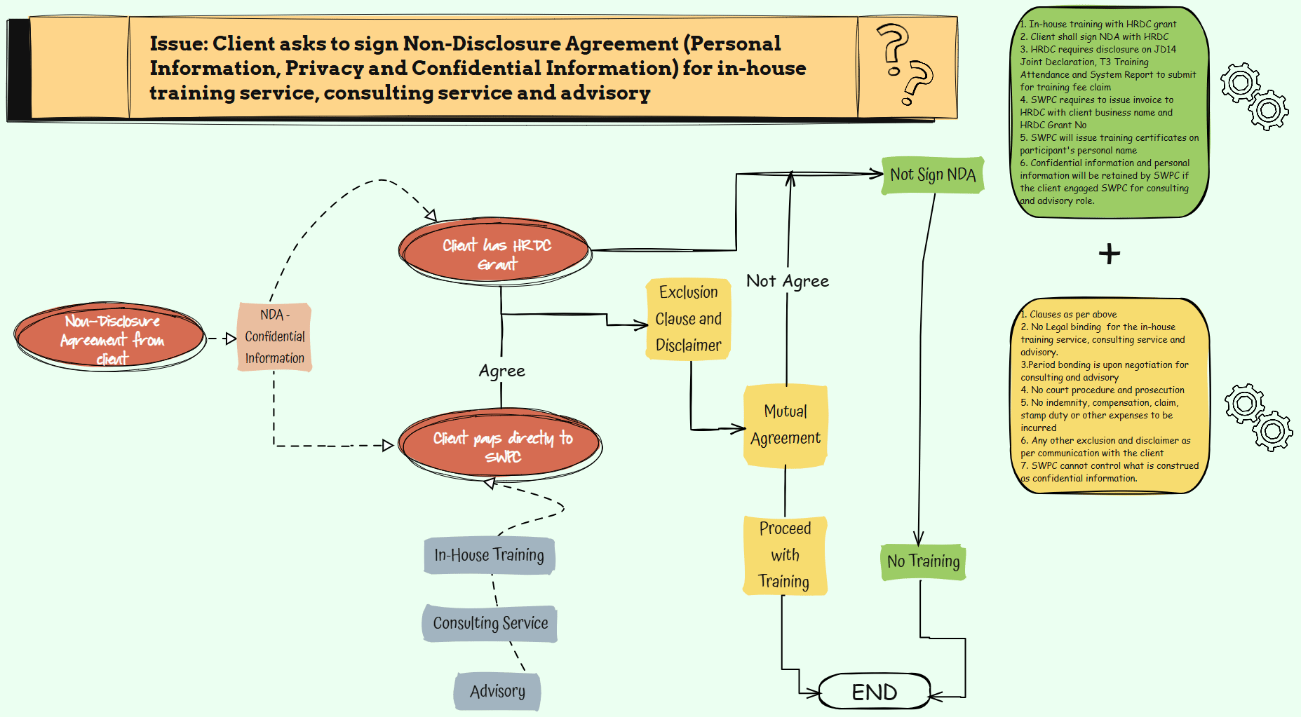 When the client is asking SW Project Consulting (SWPC) to sign non-disclosure agreement - Confidential Information, Personal Information and Privacy to attend in-house training organized by SWPC, or engaging SWPC to undertake consulting service and advisory, the response is at below.